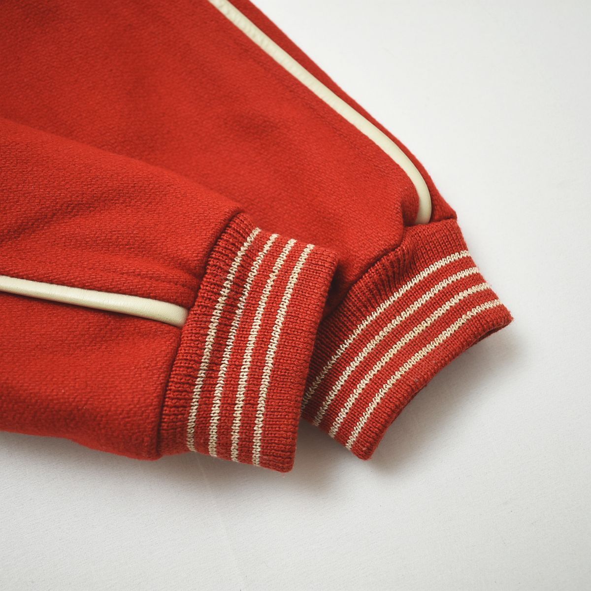 裏地は中綿入りキルティング仕様で防寒性も高く、ストリートからライブシーンまで幅広く活躍。ラグランスリーブの切替デザインが90sらしい雰囲気を引き立て、レッドカラーがコーデの主役として映える仕上がりになっています。