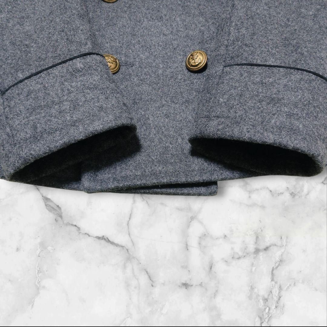 存在感のある金ボタンと上質なウール混素材が特徴で、キルティング裏地付きのため防寒性も高い一着です。
