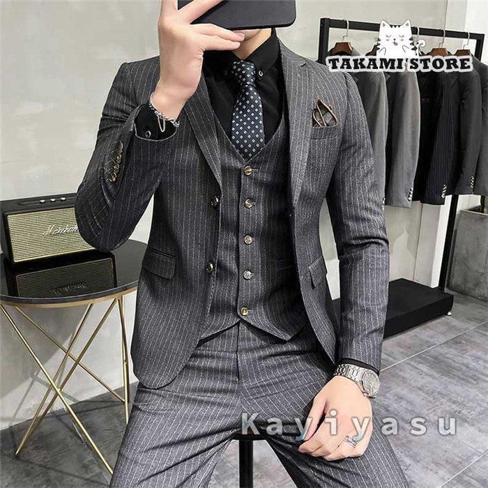 スーツ 成人式 スラックス スリム シングルスーツ 長袖 ストライプ ベスト メンズ ビジネススーツ 洋服 テーラードジャケット 3ピーススー