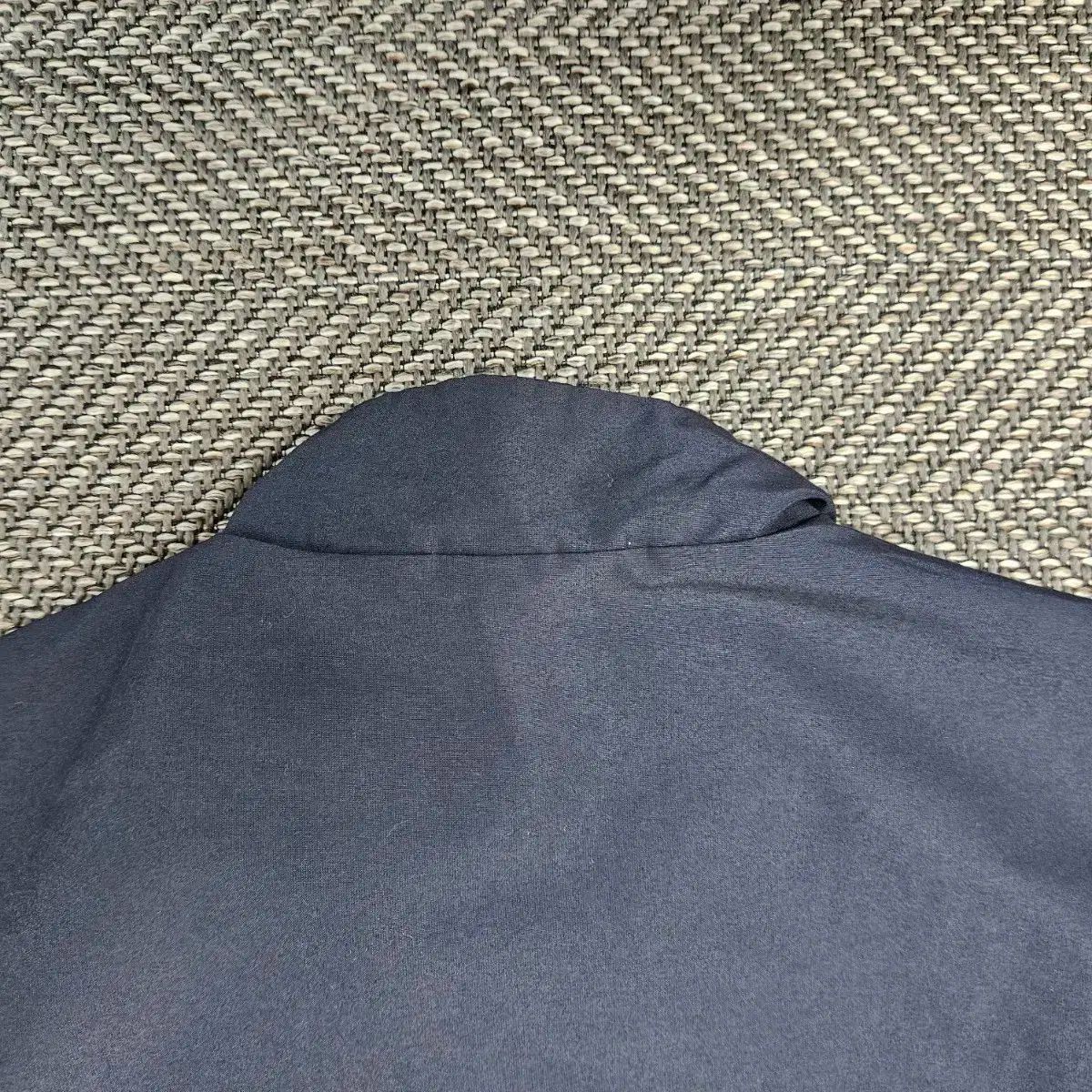 これはダークネイビーのオーバーサイズウインドブレーカージャケットです。裏地はメッシュ製で、商品もゆとりが出るので、オーバーフィットです。コットンの状態はキレイで、あまり着心地は良くありません。