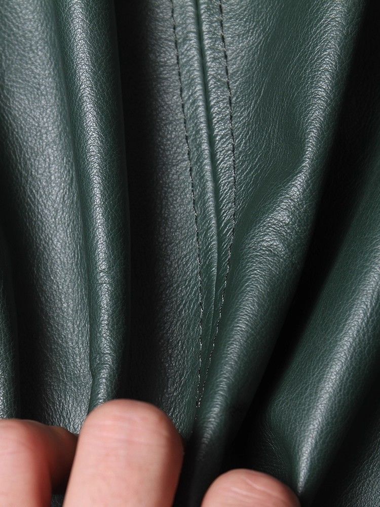 こちらは**グリーン透染め頭層牛革(フルグレインレザー)**を使用した高品質なレザージャケットです。