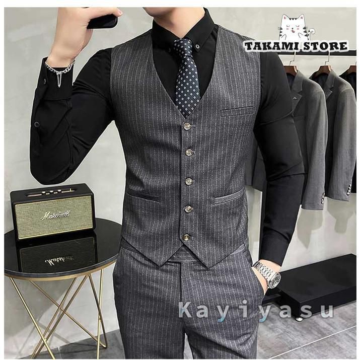 スーツ 成人式 スラックス スリム シングルスーツ 長袖 ストライプ ベスト メンズ ビジネススーツ 洋服 テーラードジャケット 3ピーススー