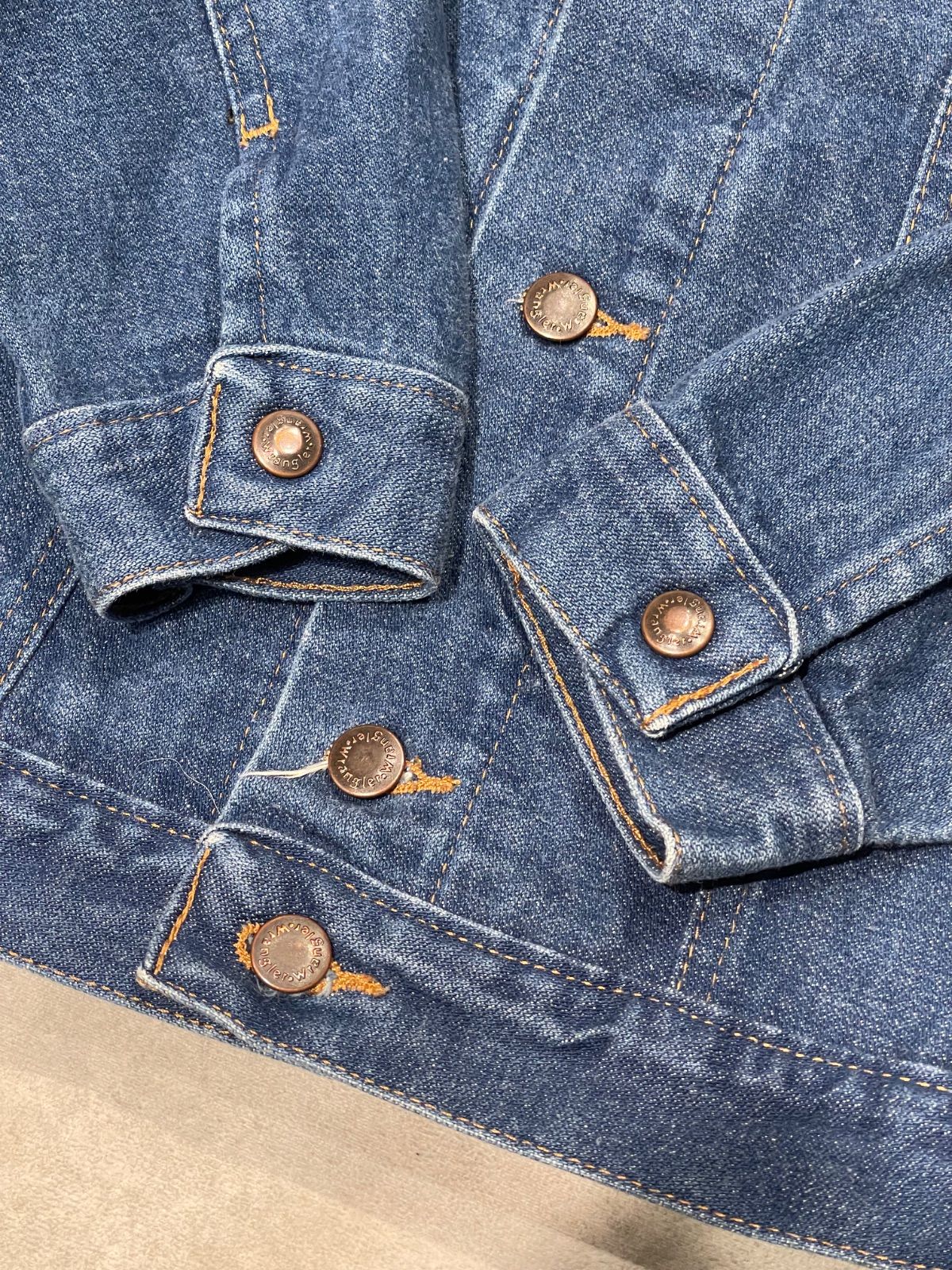 胸ポケット下のステッチがVに収束させない事で、安定的で無骨な印象を与え、ラングラーの起源でもあるカウボーイ仕様を忘れずに表現。ざらつきのあるコットン地はリーバイスのようなムラ感のある色落ちではなく、均一感を保ち、1つのアイテムとして歳を重ねていくみたい。色味もくすみっ気があっていい個体ではないかと思います。
