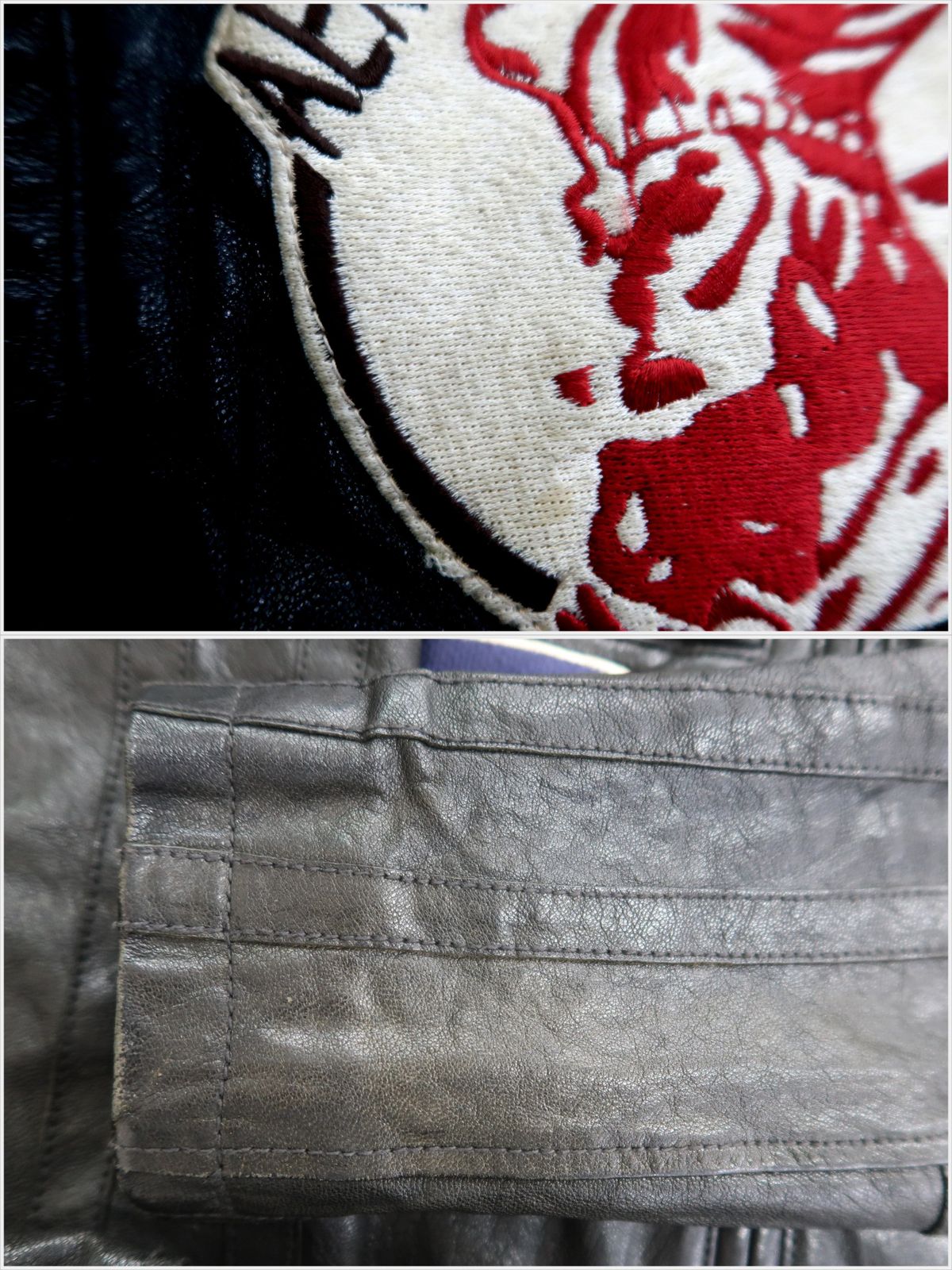 各所にシワ、スレ剥げ、袖に色褪せ、ワッペンに汚れ、金具に緑青、裏地にほつれがあります。