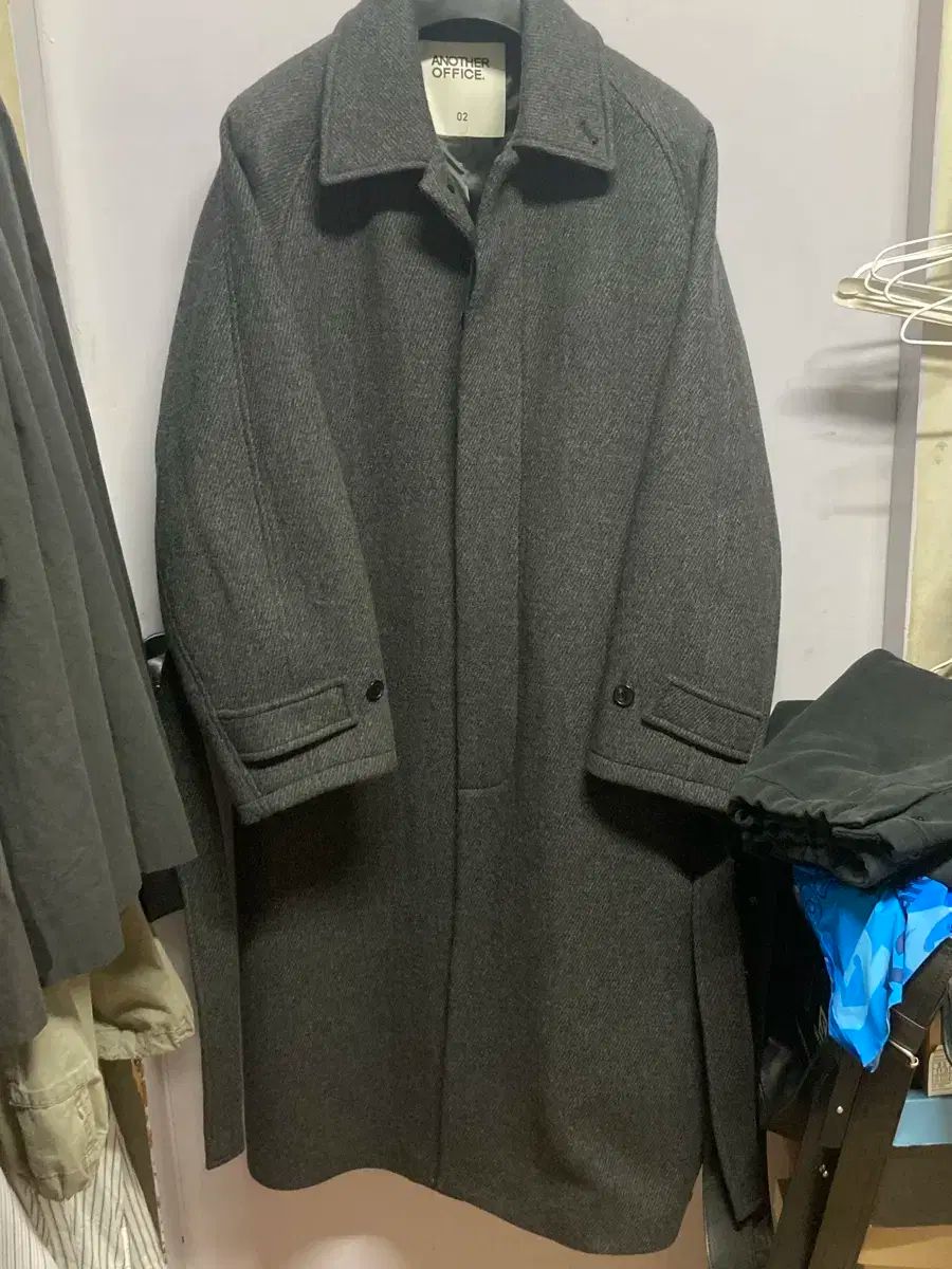 ANOTHER OFFICE (アナザーオフィス) 24FW ベルト付き バルマカーン コート チャコール カラーです。正確な品名は Torre Italian Wool Belted Coat で、100 サイズ 程度です。