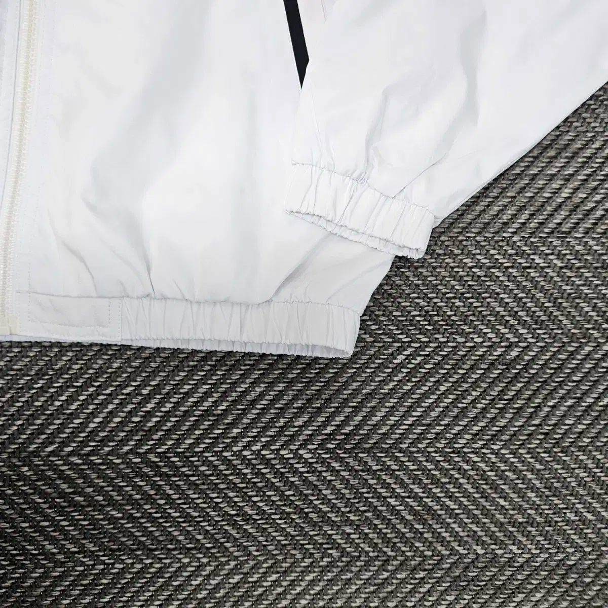 これは白いウインドブレーカージャケットです。タグは95と記載されていますが、商品は余裕を持って出てくるので、サイズ100には余裕があります。裏地が二重になっているので、春秋シーズンに着用するのに最適です。状態はきれいです。