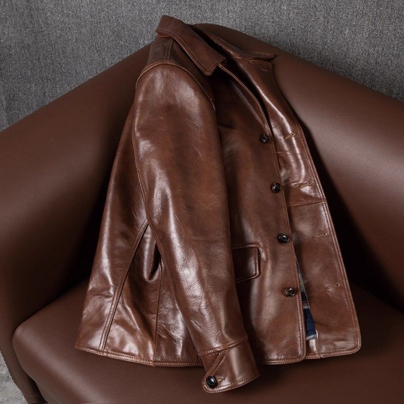 こちらは、頭層馬革(フルグレインホースレザー) を使用したメンズレザージャケットです。
