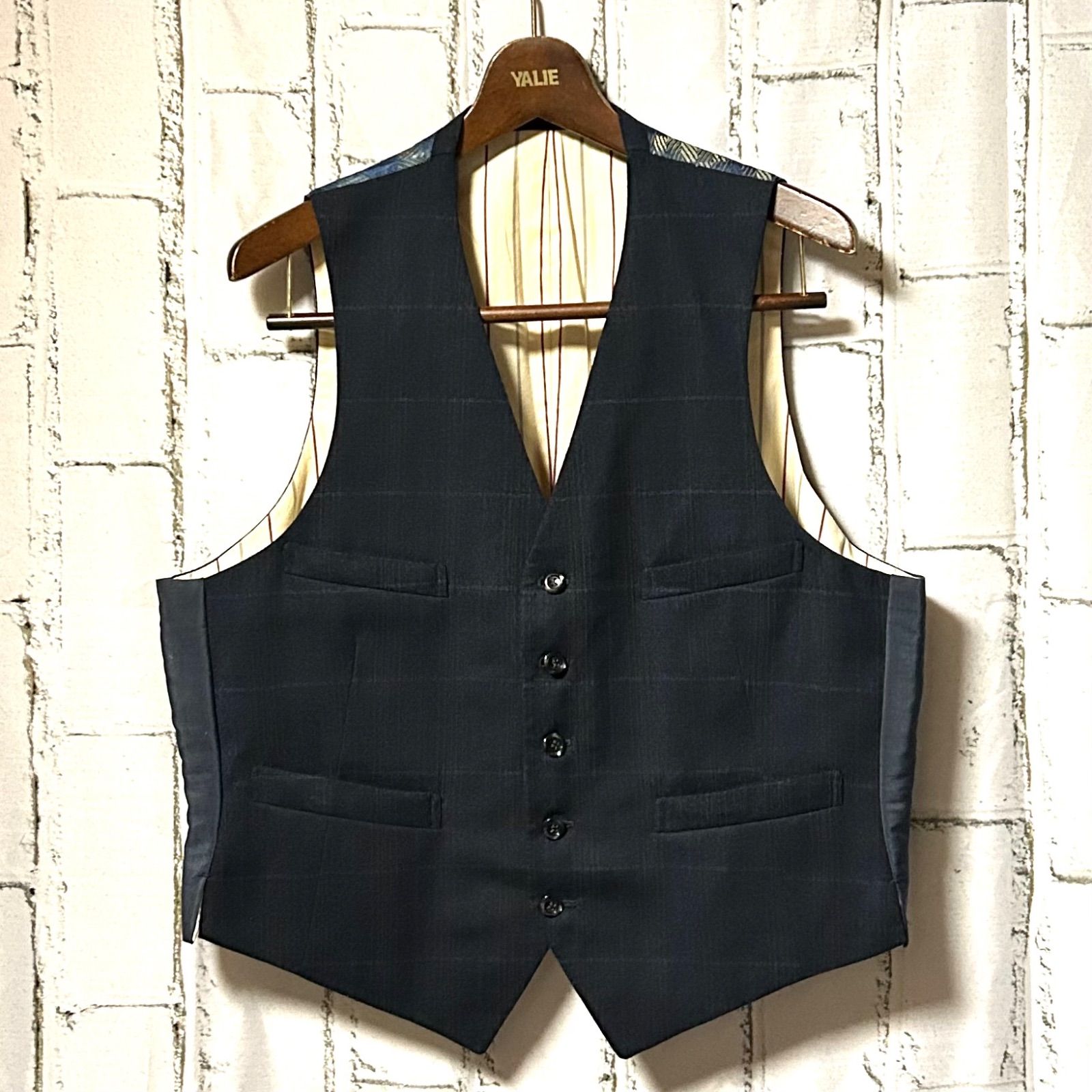 美品 60S ヴィンテージ セットアップ 3ピース シングル スーツ チェック 濃紺 ネイビー 青黒 ブルーブラック L~XL相当 ジャケット ベスト スラックス 1タック YZIPジッパー 春 秋 冬 クラシカル フォーマル 冠婚葬祭 スリーピース 三つ揃え ドレスカジュアル 成人式 結婚式 菅田将暉 ピース又吉 吉沢亮 横浜流星 Vintage 60年代