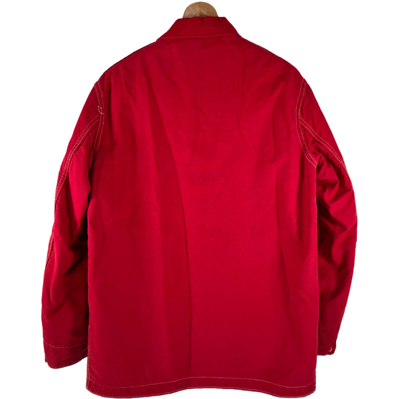 鮮やかなレッドは非常に珍しいカラーで、ヴィンテージ市場でも希少性の高いモデルです。j丈夫な素材で襟はコーデュロイになっており、実用性とファッション性を兼ね備えています。