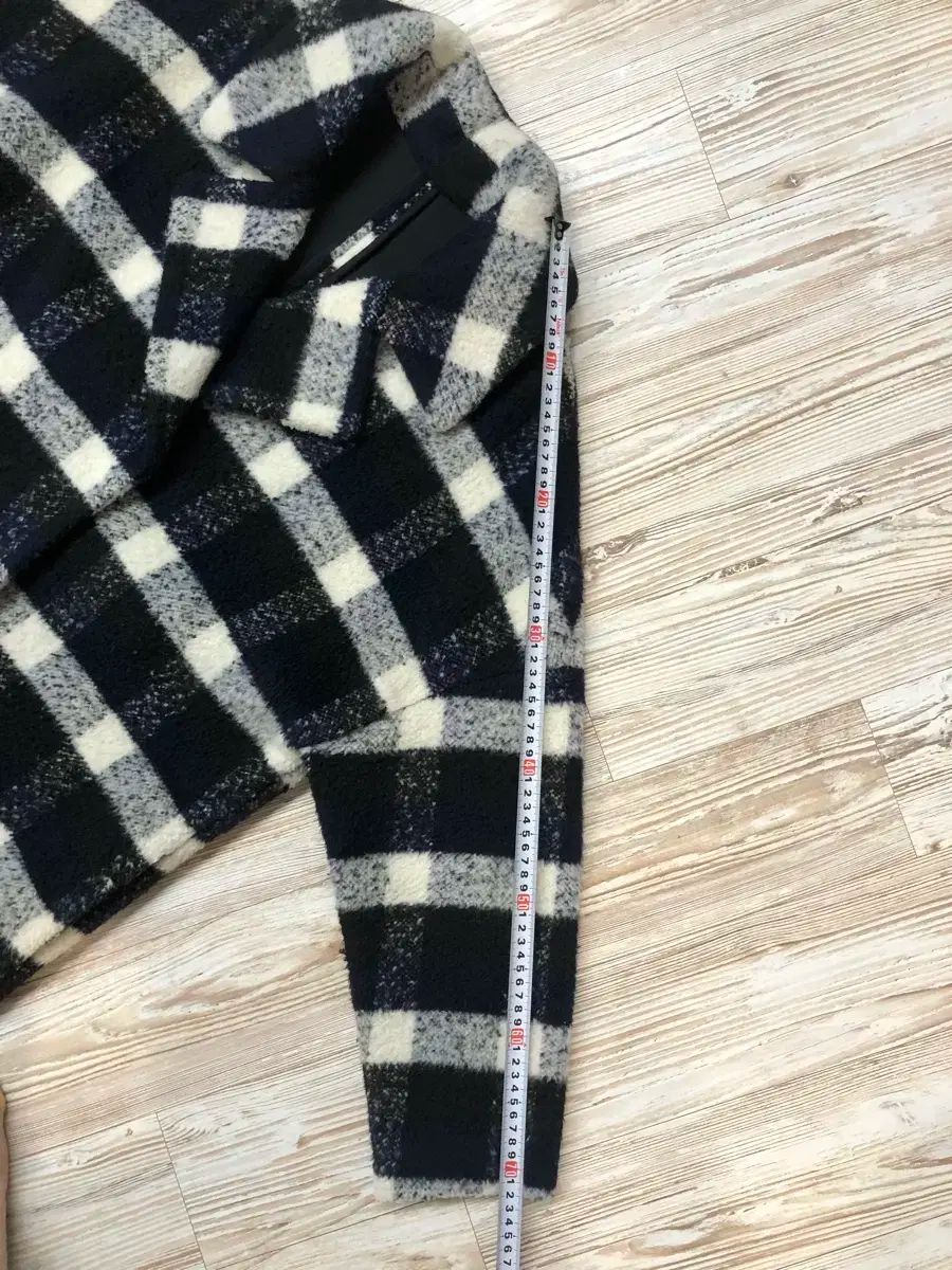 ブラック アンド 白 톤의 CHECK ロングコート です。実寸 サイズ は 写真に 見える 줄자로 確認 お願いします。