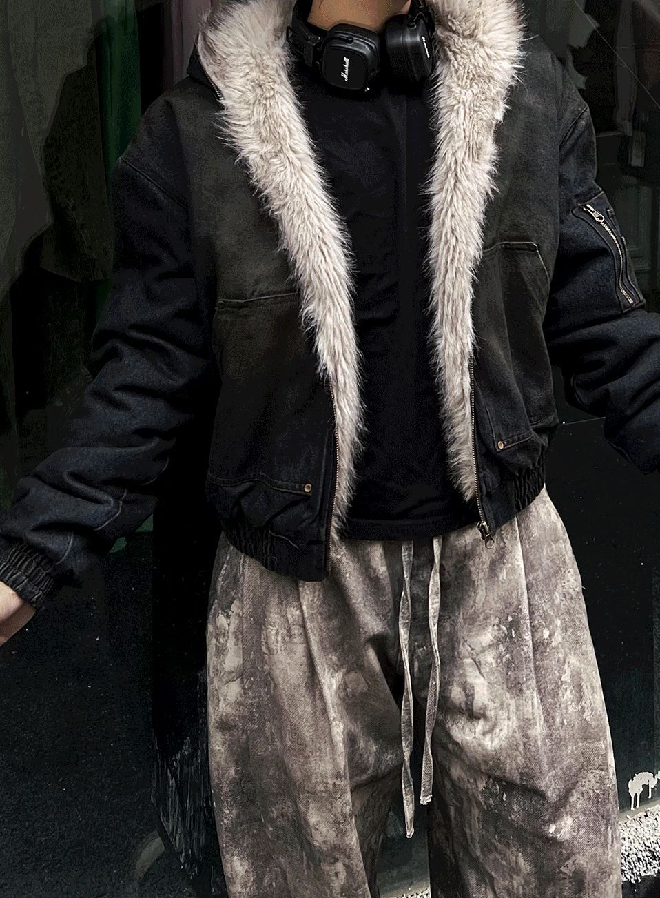 COSYHARU Nunil fur trim hooded dark blue jumper