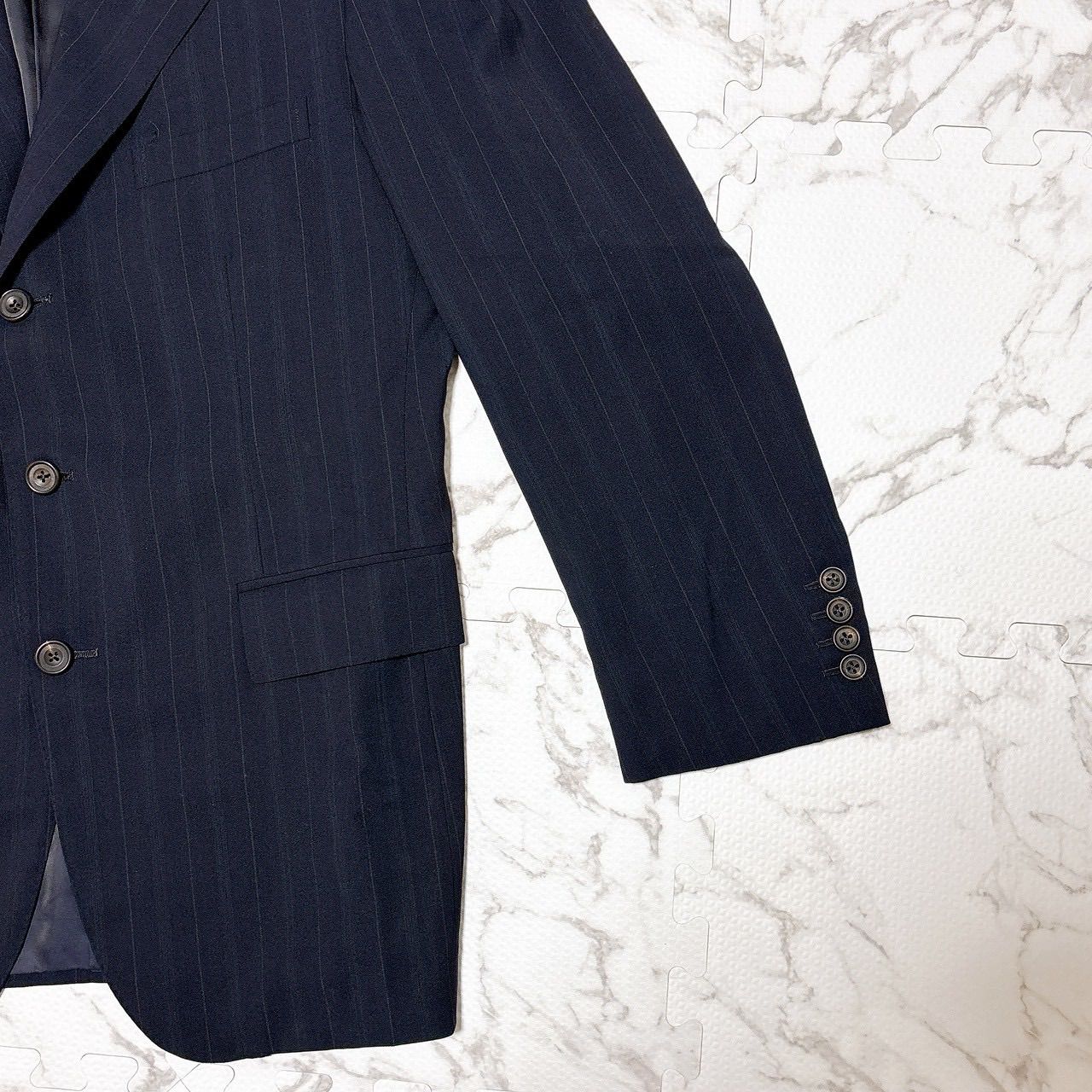 Ermenegildo Zegna生地使用 ネイビーストライプスーツ Y 38 R 細身シルエット2ボタンセットアップ 上質ビジネス 就活 冠婚葬祭 学校行事にも 春秋冬対応 大人の品格漂う一着 オンオフ兼用で便利 ゼニア