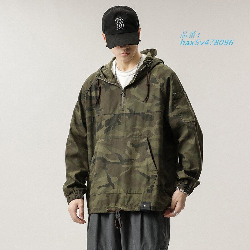 ミリタリージャケット メンズ カモフラージュ 迷彩柄 ハーフジップ フード付き ジャケット ゆったり アメカジスタイル プルオーバーかっこいい hax 5 v 478096