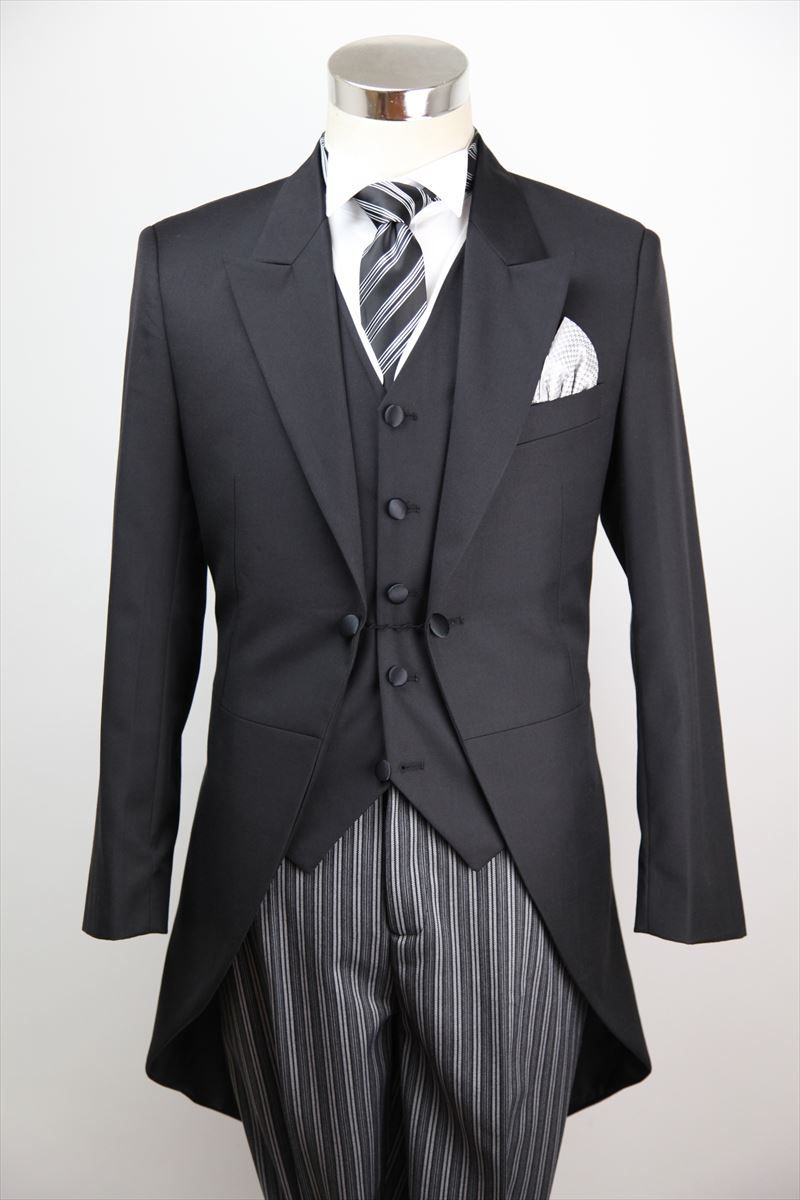 ジャケット、パンツ、ベスト、黒縞ネクタイの4点セット。
