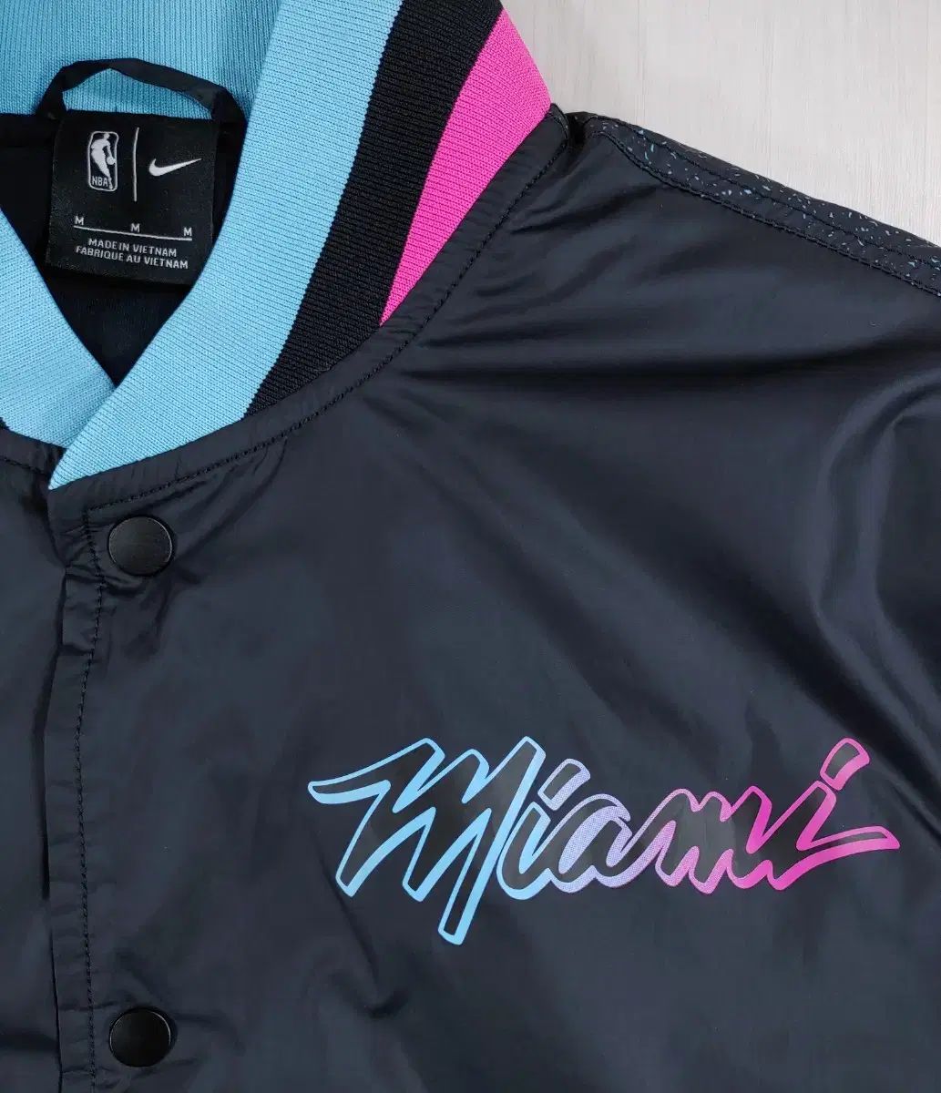 ナイキマイアミ NBA ジャケットサイズ M.明るい色がアクセントのスタジアムジャケットです。袖とネックラインのピンクとライトブルーの組み合わせが美しいです。ご不明な点がなければ、すぐに安心してお支払いいただけます!