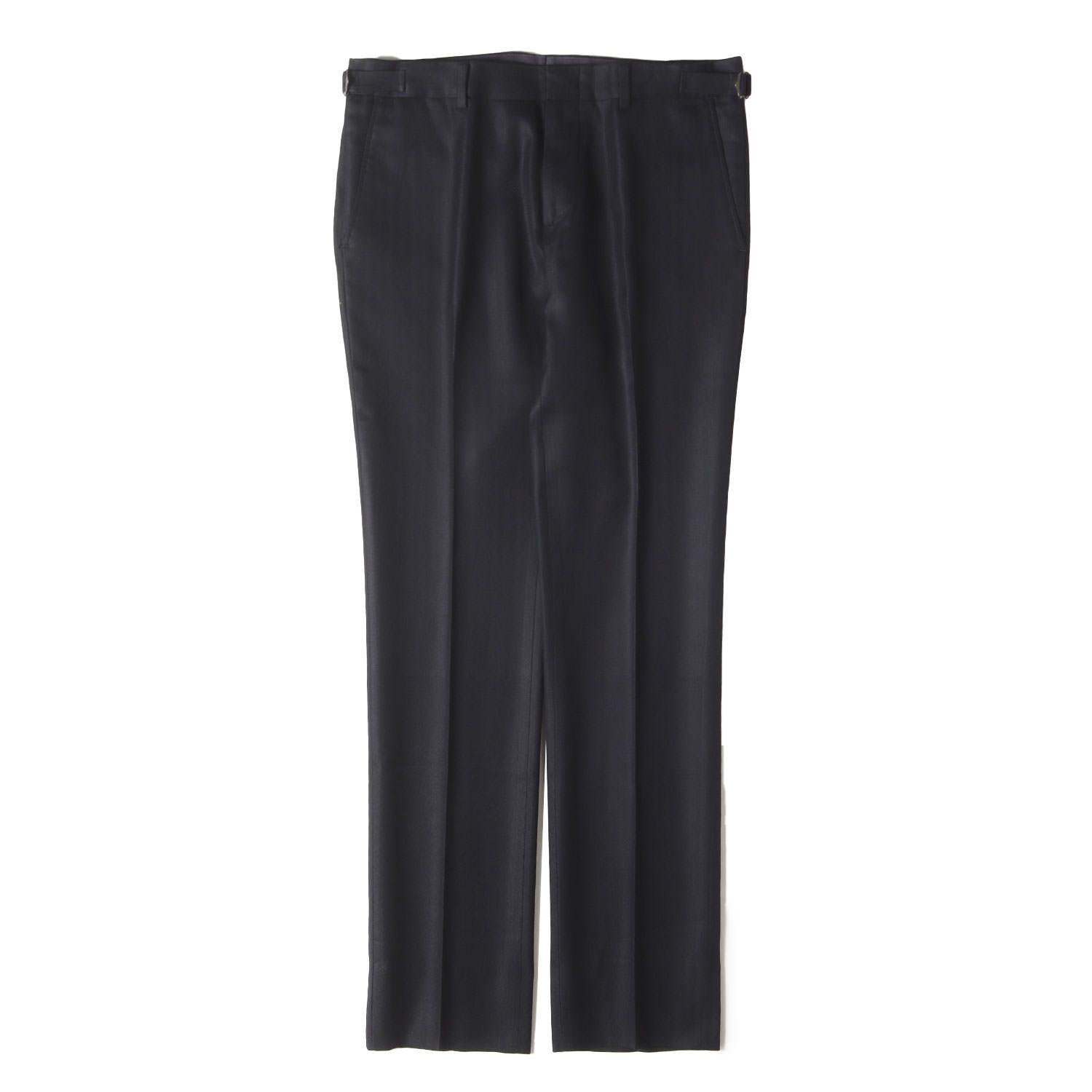 ウールヘリンボーンツイル生地を使用し、ジャケットはフロント1つボタン、ピークドナローラペル、ヘリンボーンジャガード総裏地、袖先本切羽3つボタン、フロントダーツ、センターベント仕様、スラックスはサイドアジャスターデザイン、スリムストレート仕様で仕上げられたセットアップスーツです。