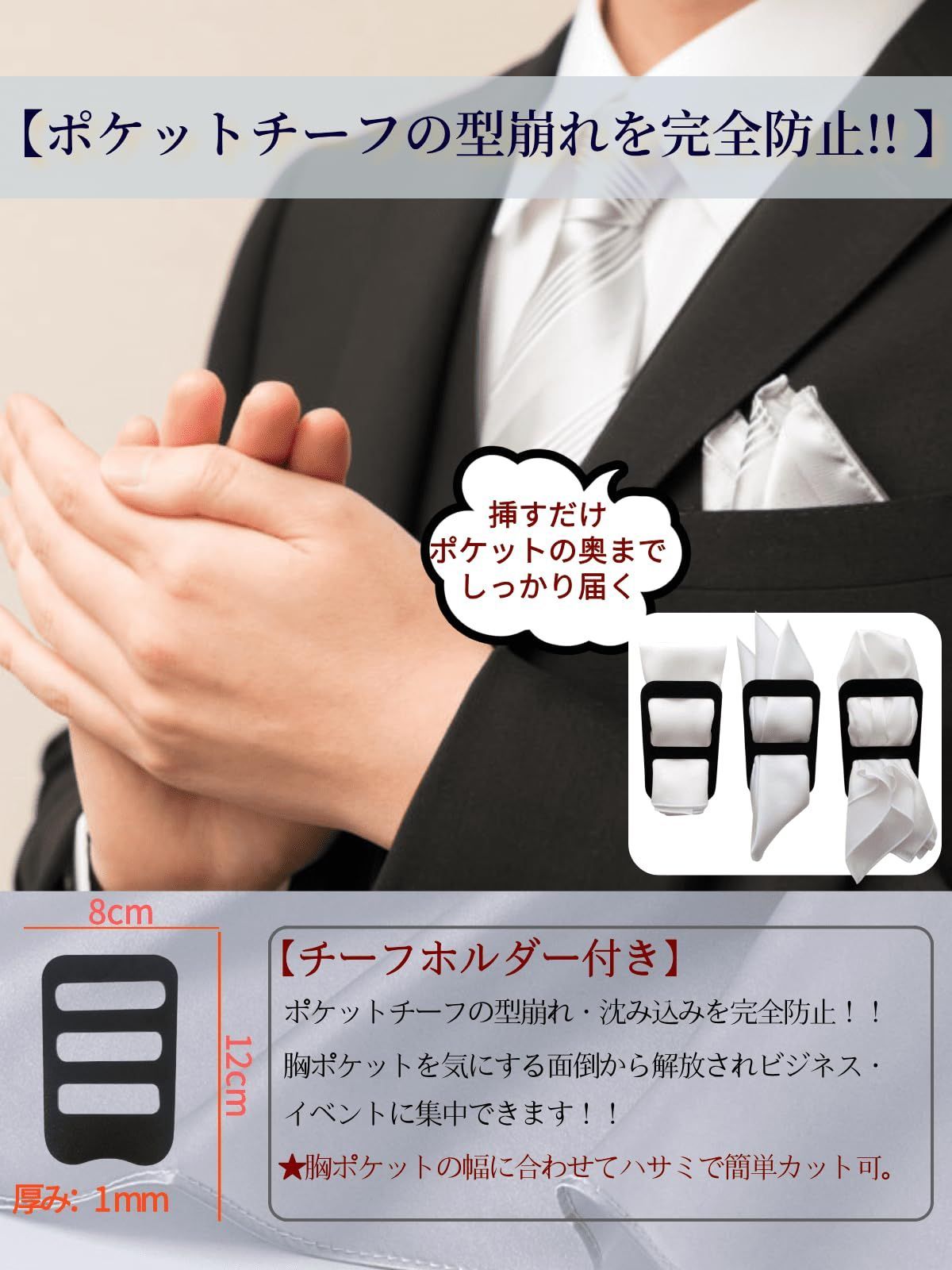【ポケットチーフの型崩れを完全防止!! 】ポケットチーフの型崩れを防止するホルダーが付き。ポケットチーフを穴に通してポケットに挿すだけで 型崩れ・沈み込みを完全防止。ポケットチーフを気にする面倒から解放され ビジネス・イベントに集中できます!!