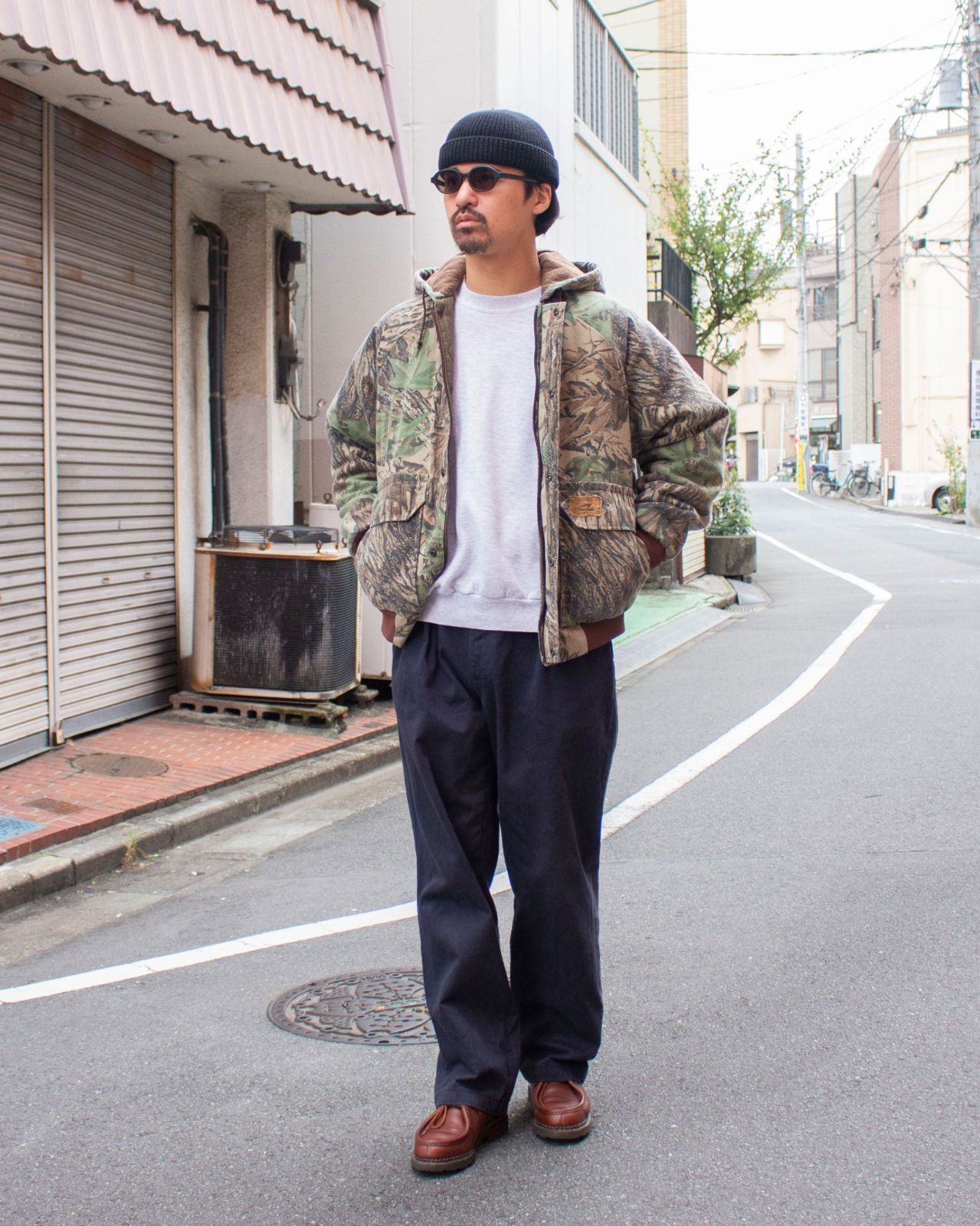 ハンティングウェアらしい無骨さと、リアルツリーカモの洒落感が格好いい1着です。スウェットやデニムと合わせたカジュアルスタイルにもよく馴染む、万能なアウターです。