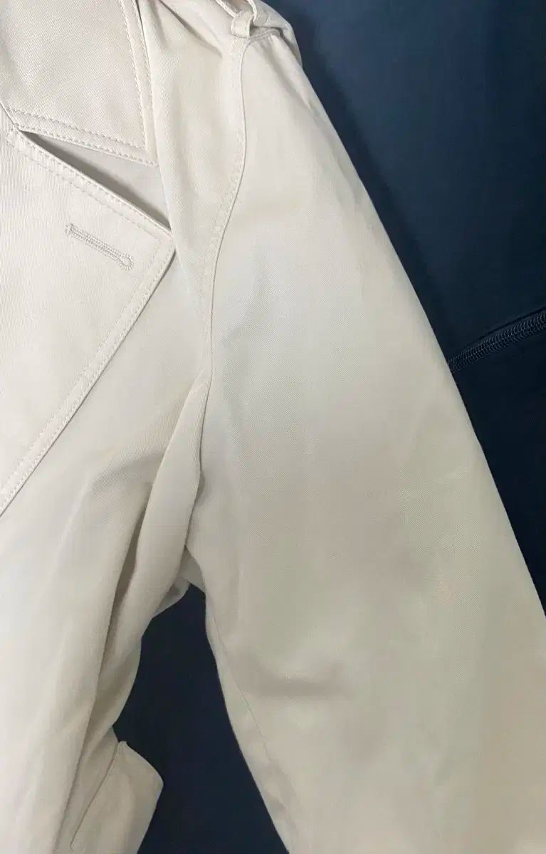 近寄ってシミがないか確認したところ、左腕の前側に微細なシミを見つけ、写真4枚目に掲載しました(2枚目の写真の黒い点はホコリです)。服を分析するように見るのでなければ分からない程度のものなので、気になるほどではないと思います。