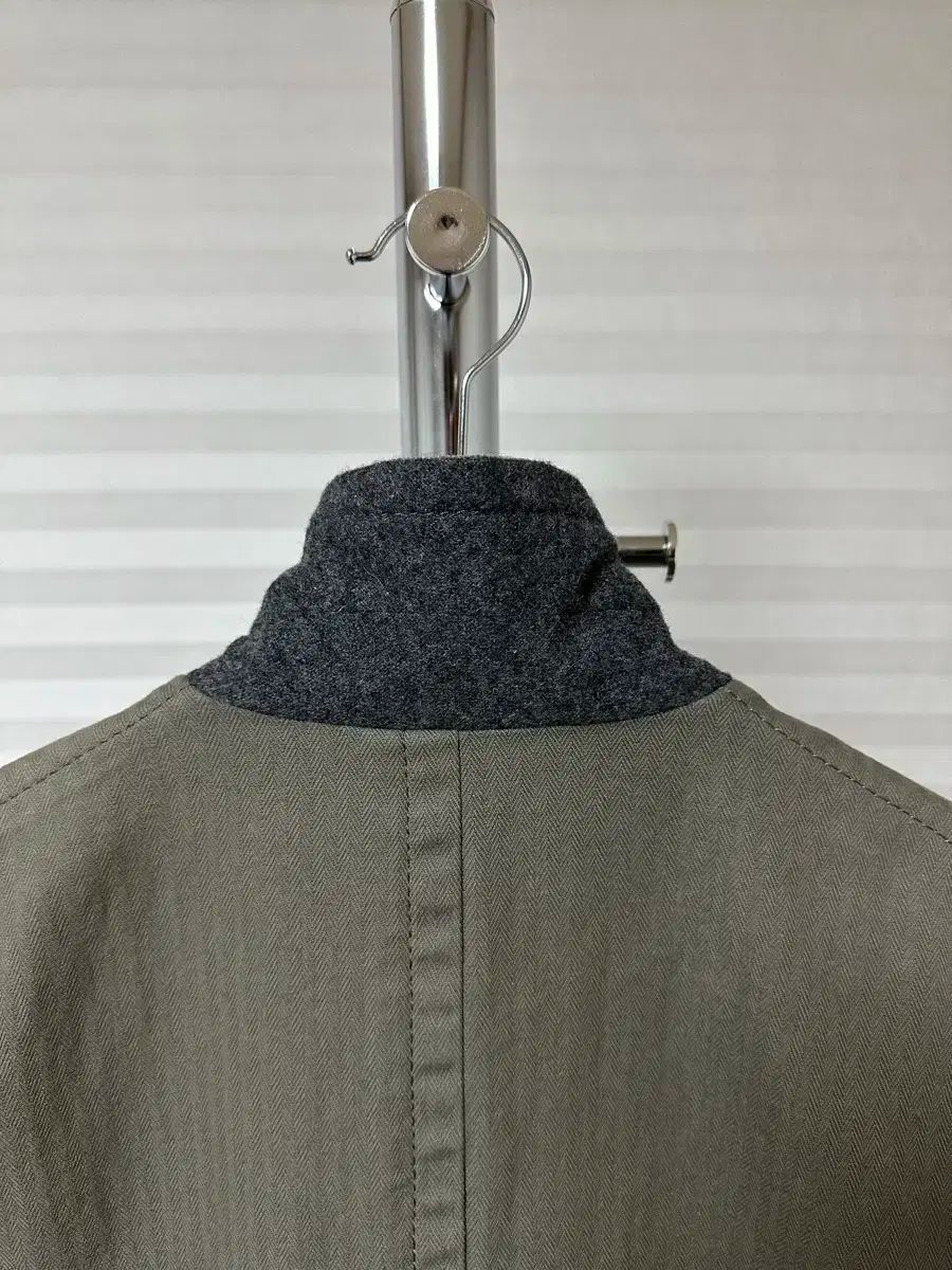 コーデュロイの襟、ボタンのディテール、ストライプの裏地が、ブランド独特のハイブリッドムードを醸し出しています。