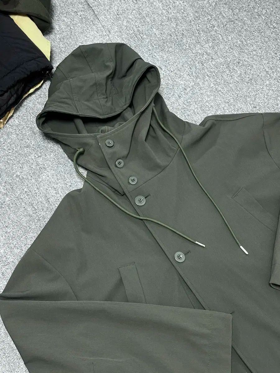 厚みのあるナイロン素材で、着た時のフィット感が良いコートです。季節の変わり目に着やすく、ハイネックボタンのディテールがかわいい一品です。