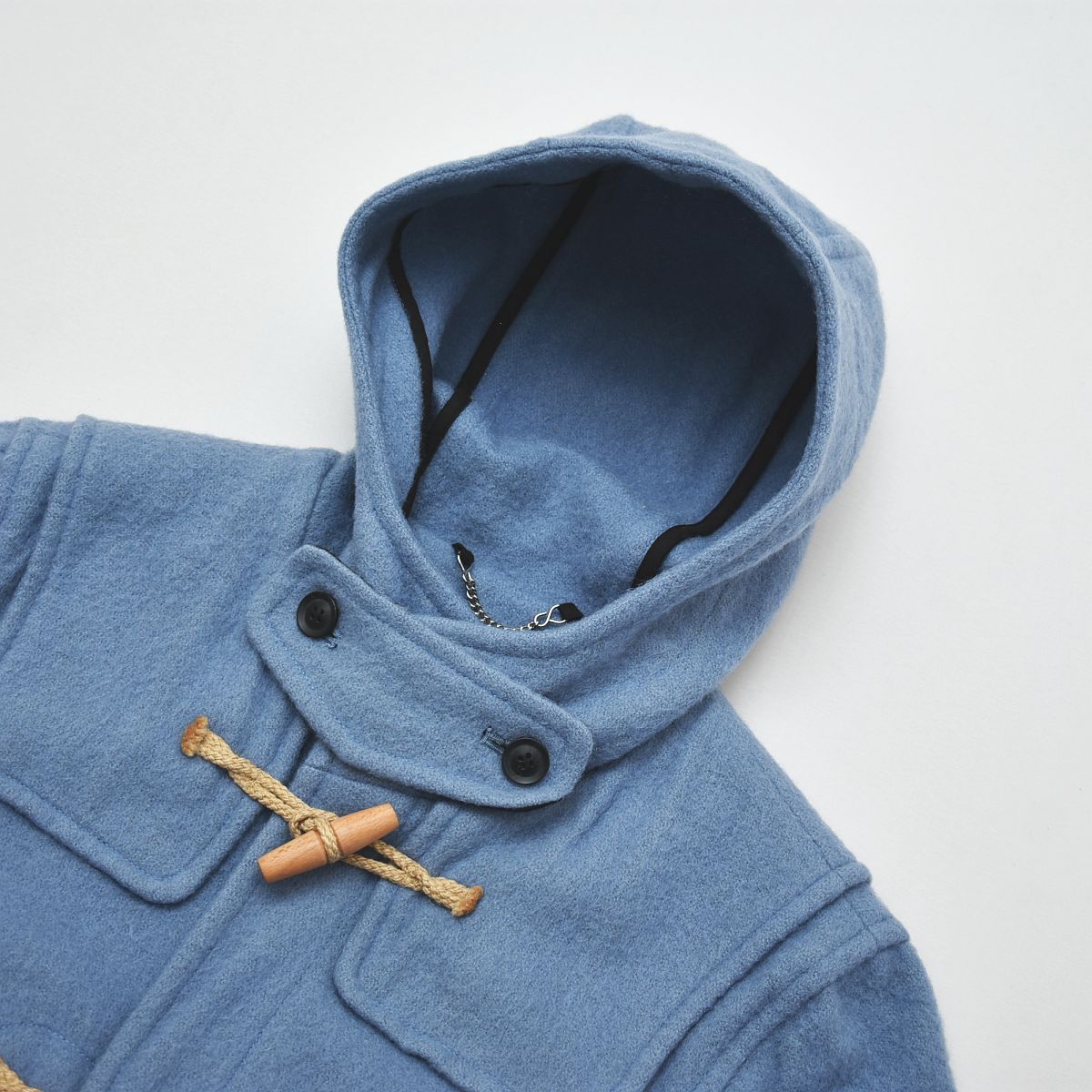 ナチュラルなベージュのトグルボタンとロープのコントラストが、柔らかなサックスブルーのボディに映える上品なデザインです