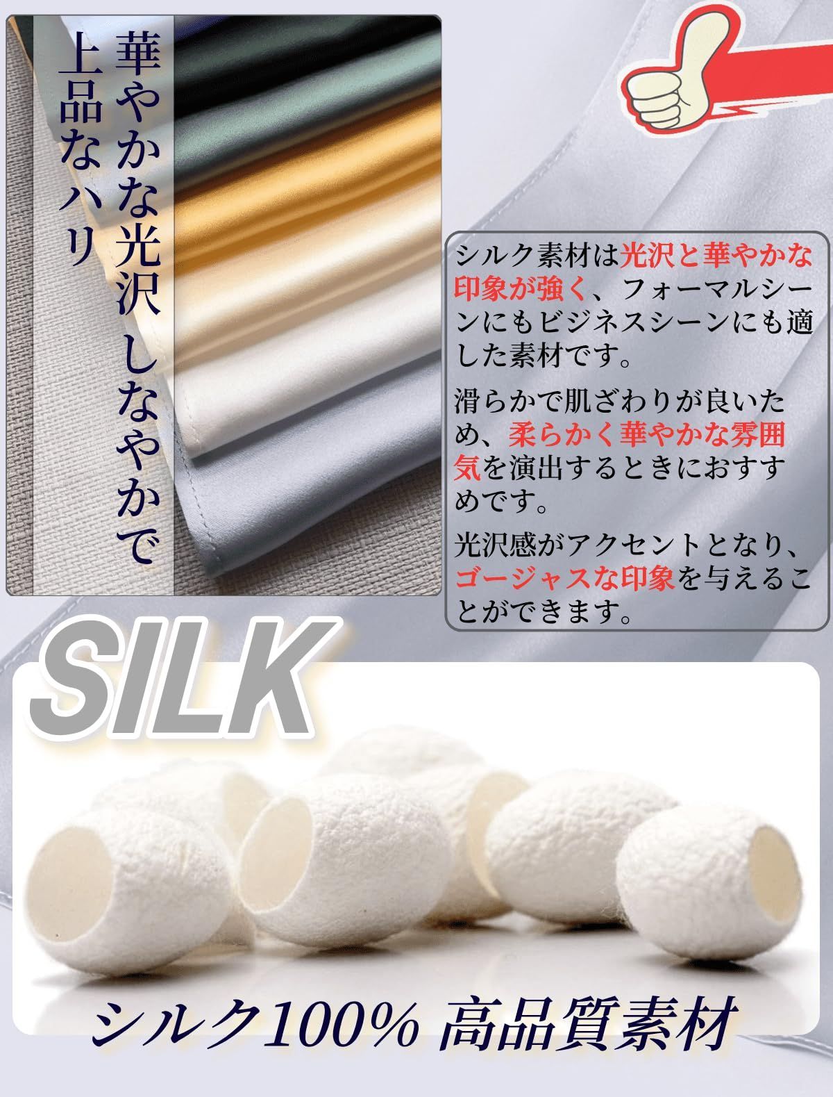 【素材構成】100% シルク(絹) 16匁 シルクは特有の上品な美しい光沢を生みます。艶のある光沢感が特徴で、胸元に華やかな雰囲気を与えます。大切な方のお祝いの席にも安心してご利用いただけます。